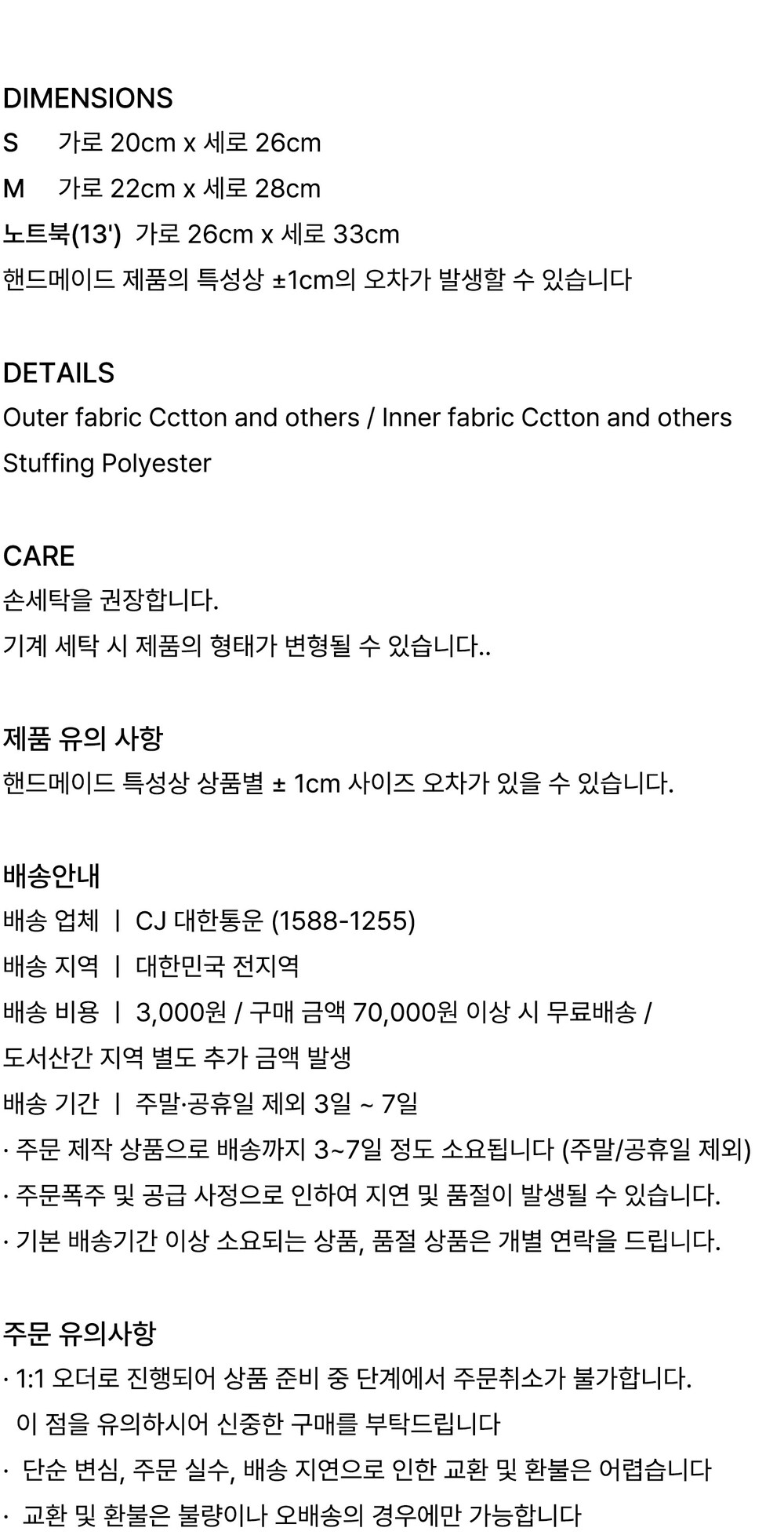 · 1:1 오더로 진행되어 상품 준비 중 단계에서 주문취소가 불가합니다. 이 점을 유의하시어 신중한 구매를 부탁드립니다